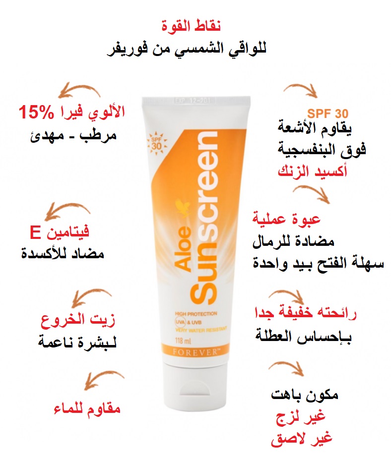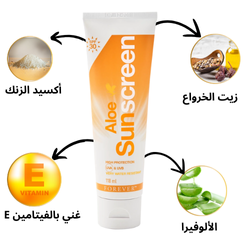1. حماية مثالية من الشمس: واقي الشمس Aloe Sunscreen من Forever هو الحل المثالي للحفاظ على بشرتك محمية من أشعة الشمس الضارة. يحتوي على مكونات طبيعية مثل الألوة فيرا التي تهدئ وترطب البشرة، مما يجعل هذا الواقي مناسبًا للبشرة الحساسة. بتركيبته الخفيفة، يوفّر حماية واسعة من أشعة UVA وUVB، مما يقلل من خطر التعرّض للحروق الشمسية والتلف الناتج عن الشمس.